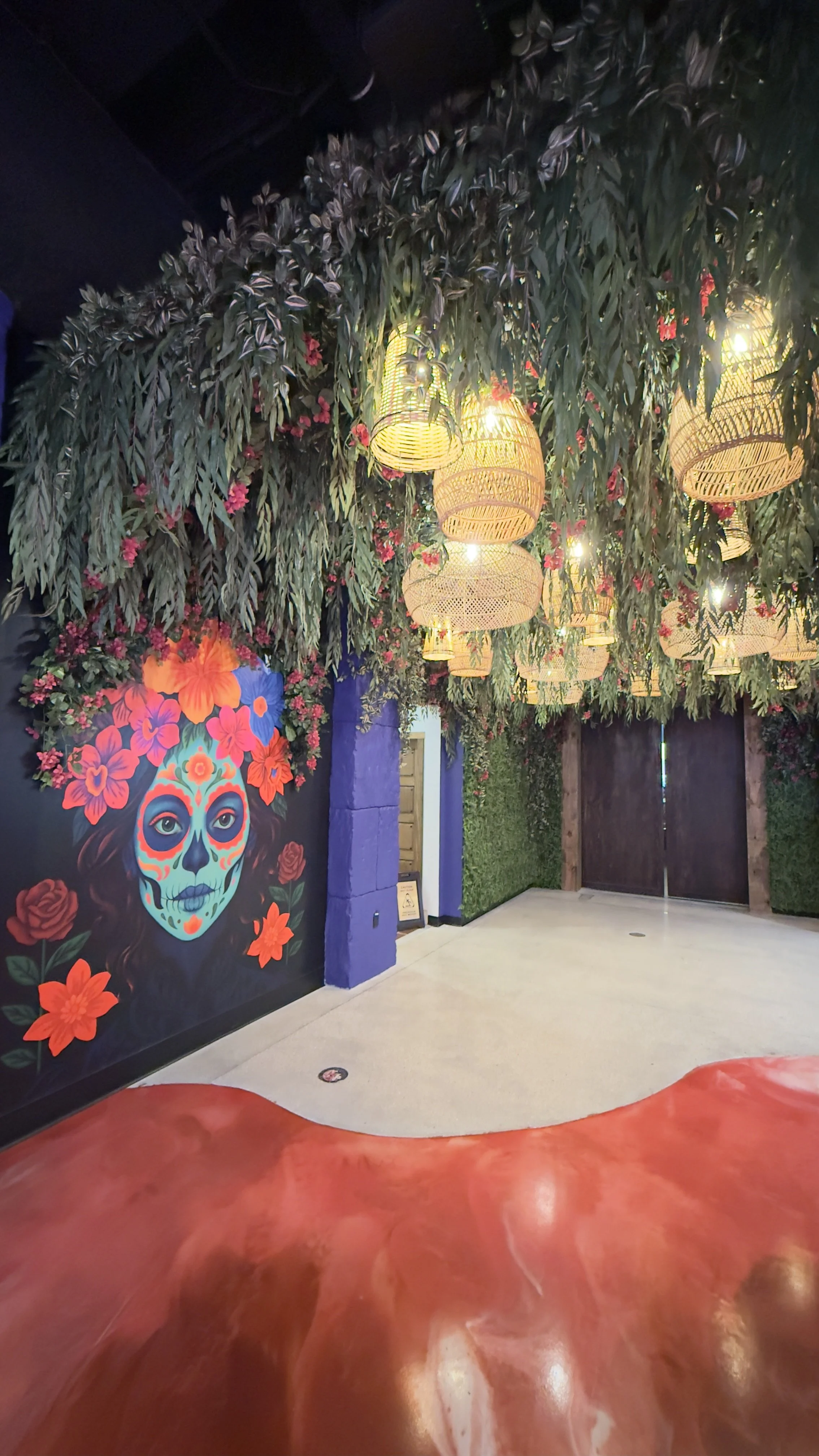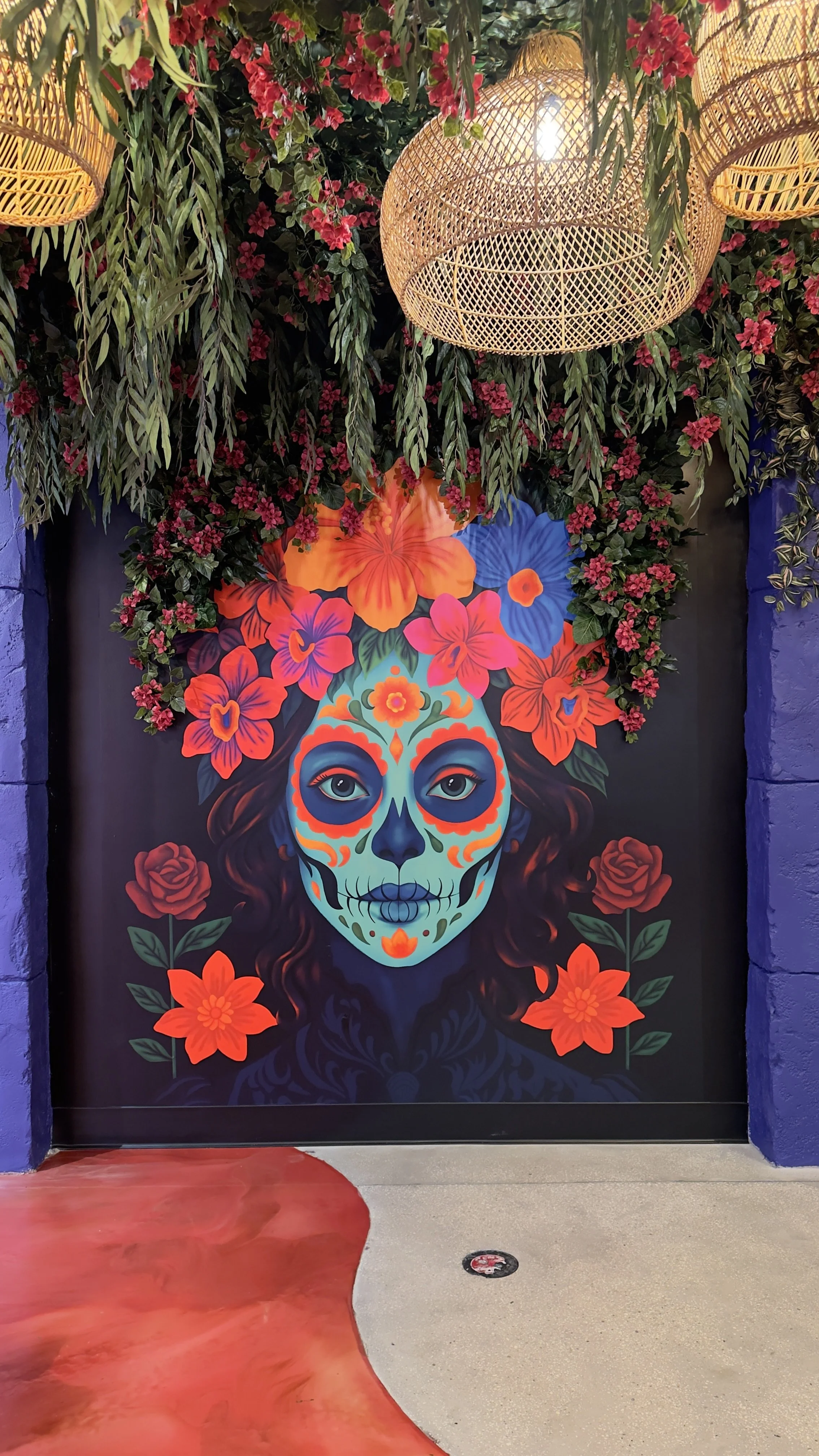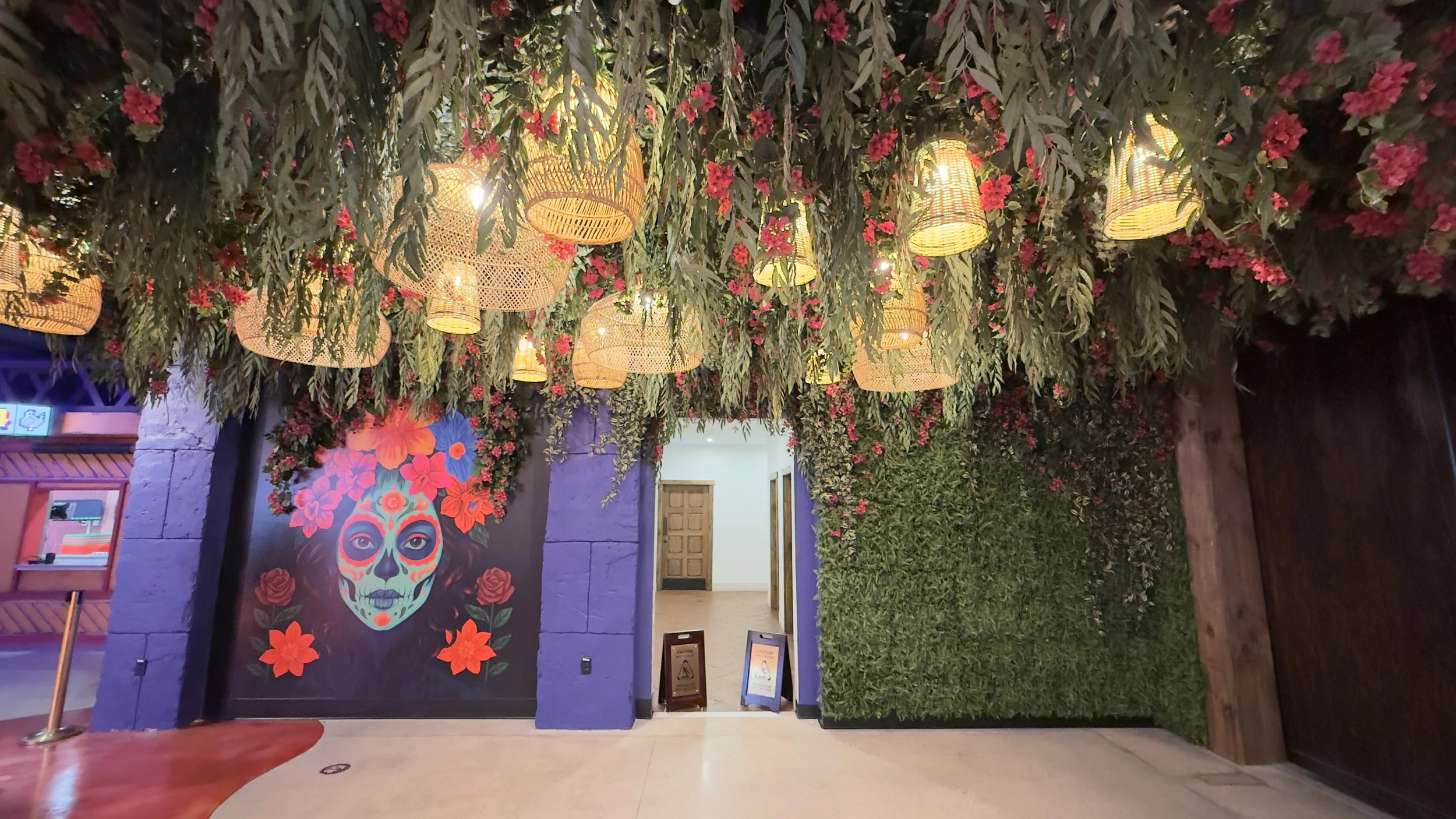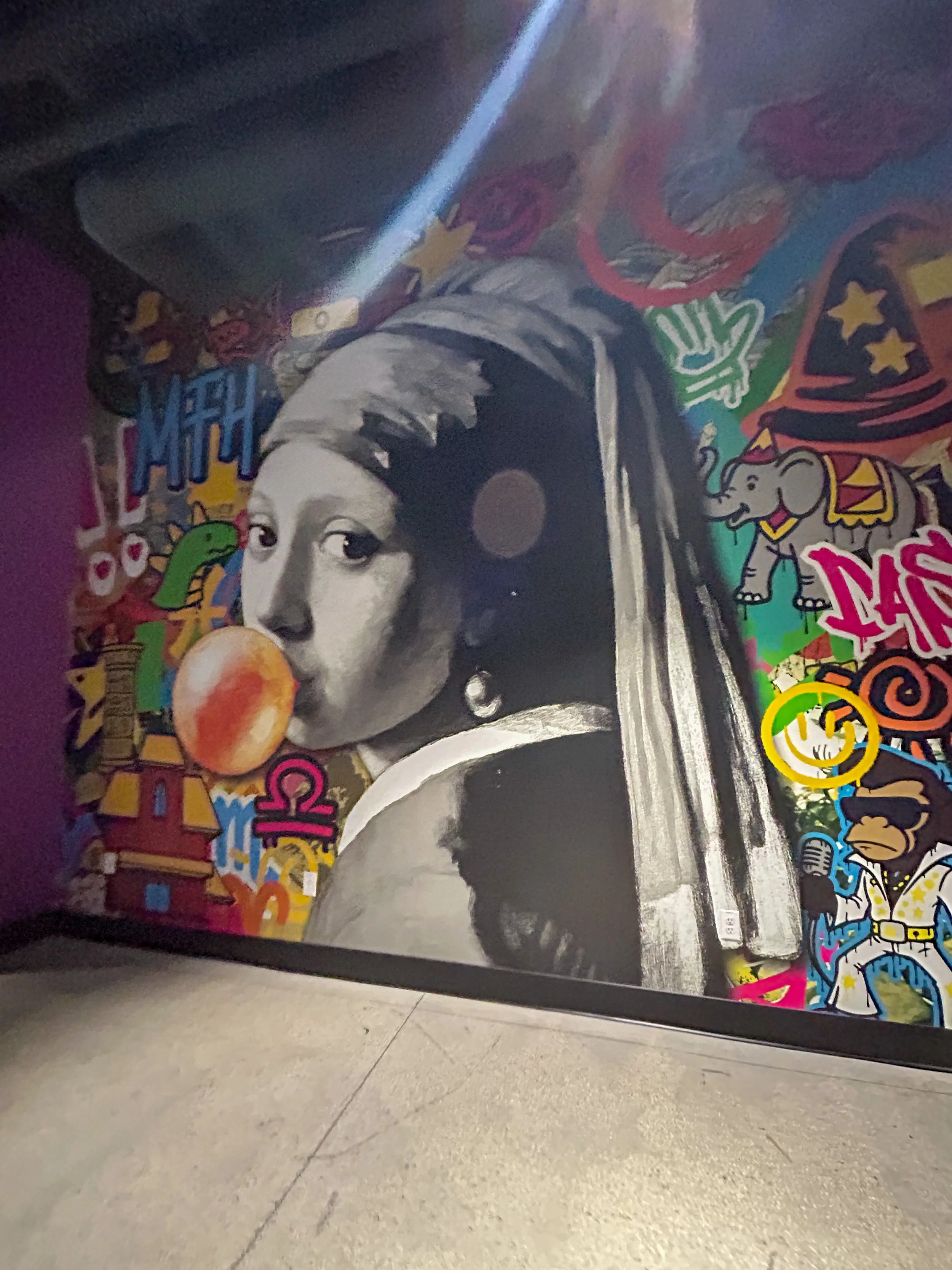The artworks mix bold styles to spark curiosity and play. A Día de los Muertos portrait adds cultural richness, the candy bear wallpaper brings whimsical sweetness, and the bubblegum Vermeer blends classical art with neon graffiti. Together, they create a vibrant rhythm that balances tradition, pop culture, and street-style energy—capturing the arcade’s eclectic, anything-can-happen spirit.